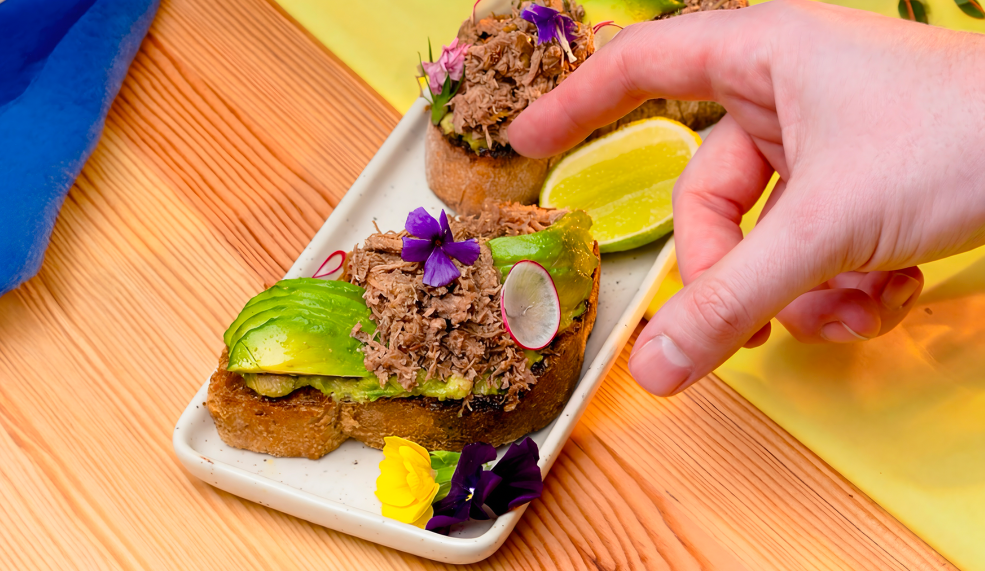 6. Tartinez généreusement chaque tranche de pain grillé avec le guacamole aux herbes. Disposez ensuite le canard effiloché encore chaud.