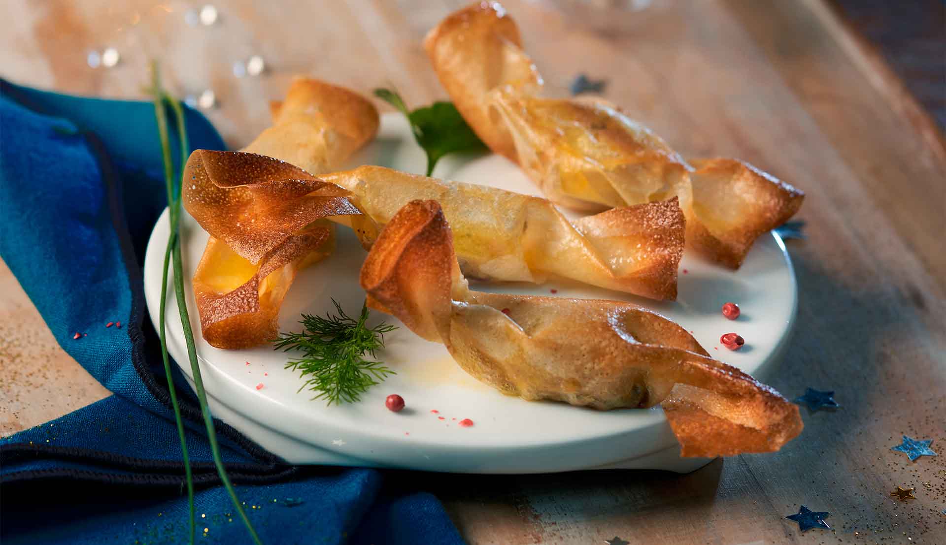 5. Disposez, sur le bord le plus étroit du rectangle, un cube de foie gras et recouvrez-le d’1/2 cuillère à café de confiture de figue. Salez et poivrez. Roulez la feuille de brick sur elle-même de façon à former un cigare.