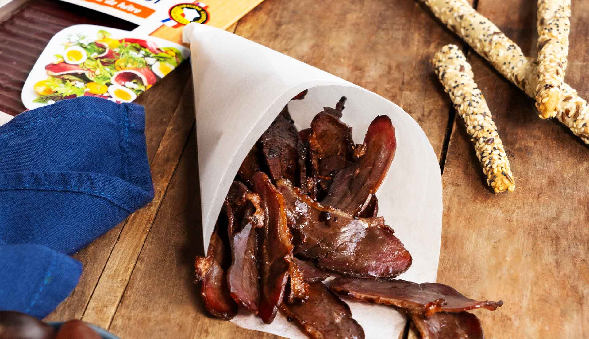 • 2. Préparez les magrets : disposez les tranches de magret fumé séché sur une plaque de cuisson recouverte de papier sulfurisé, en veillant à ce qu’elles ne se chevauchent pas.