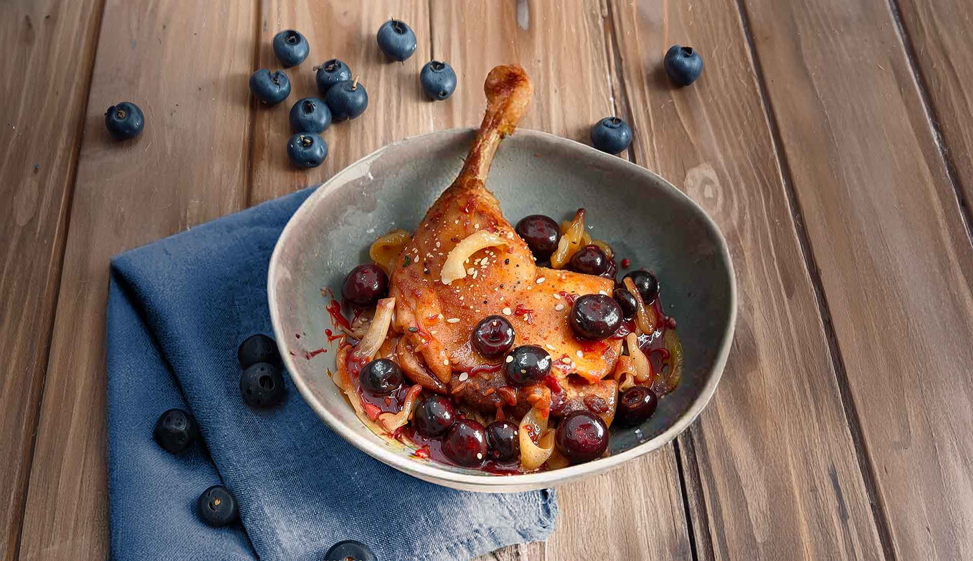 3. ider tous les oignons dans un grand plat allant au four et ajouter les myrtilles puis assaisonner. Mélanger délicatement puis couvrir de papier aluminium et enfourner 15mn à basse température (150° environ).