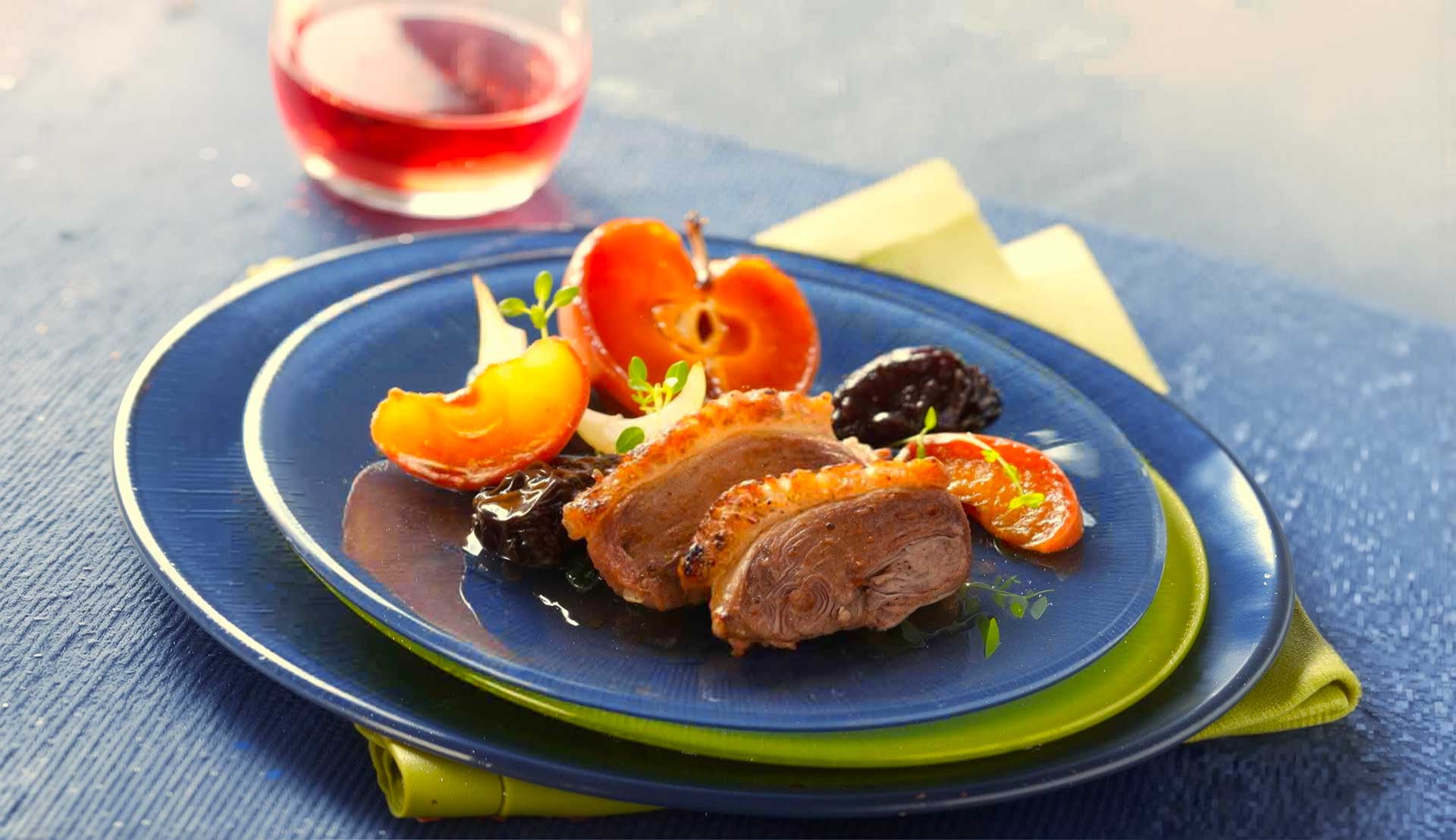 • 13. Lacérer la partie grasse des magrets, les débiter en travers en 6 tranches égales (magritons). Cuire à la poêle à feu moyen 2 min côté gras, saler, poivrer, puis 1 min de chaque côté à feu vif. Dresser en assiettes chaudes avec la garniture, sans oublier les pruneaux.