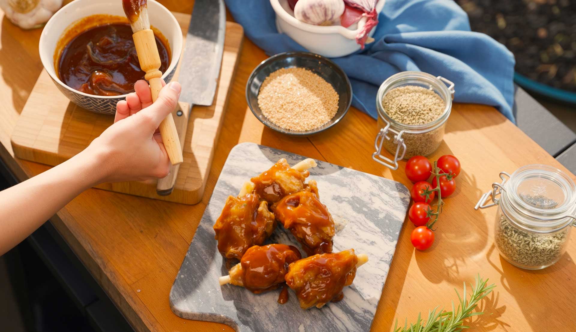• 1. Préparez la marinade dans un grand bol en mélangeant la sauce barbecue, le miel liquide, le sel et le poivre.