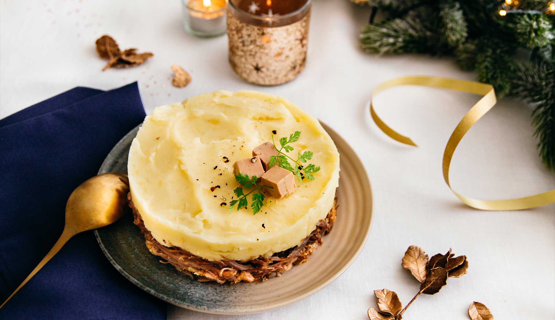 4. Mélangez le confit de canard avec les morceaux de foie gras. Déposez le mélange dans le fond d’un cercle et recouvrir de purée de pommes de terre. Servez de suite.