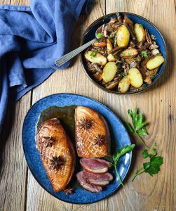 1. Coupez les aiguillettes de canard en morceaux. Pelez l’échalote et émincez-la.