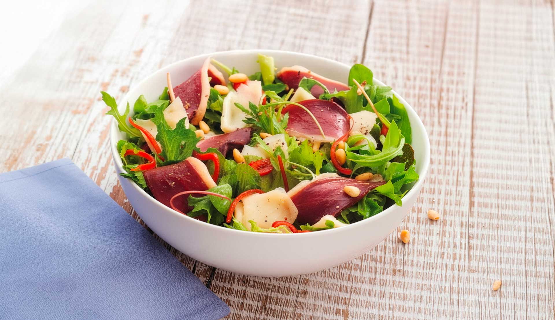 5. Coupez le fromage de brebis en copeaux à l’aide d’un économe et disposez-les sur la salade. Ajoutez les tranches de magrets séchés et parsemez de pignons grillés.
