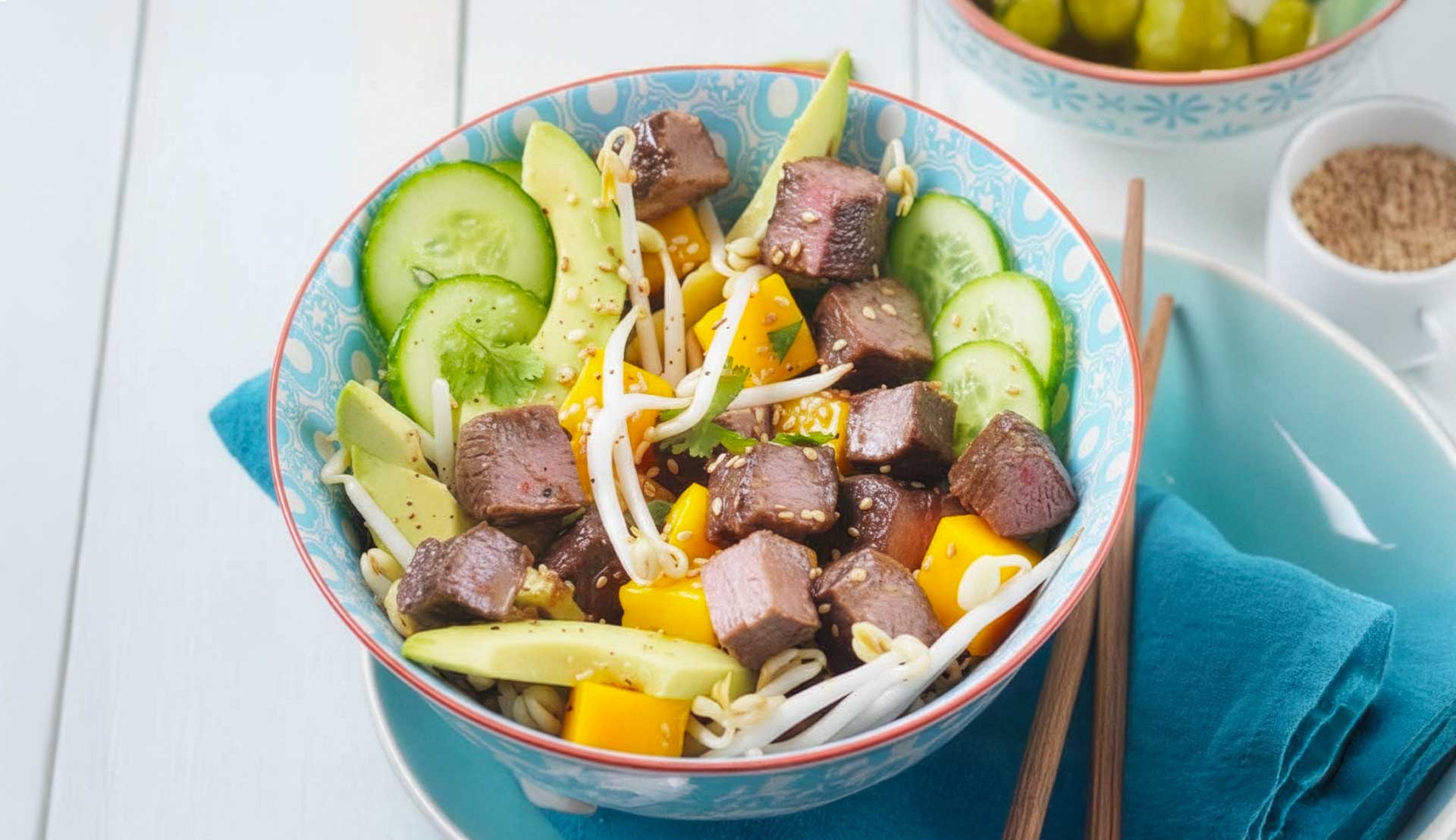 5. Disposez dans des coupelles un peu creuses les germes de soja, la mangue, les avocats et le concombre. Ajoutez les morceaux de magrets tièdes. Arrosez avec la vinaigrette et parsemez de coriandre.