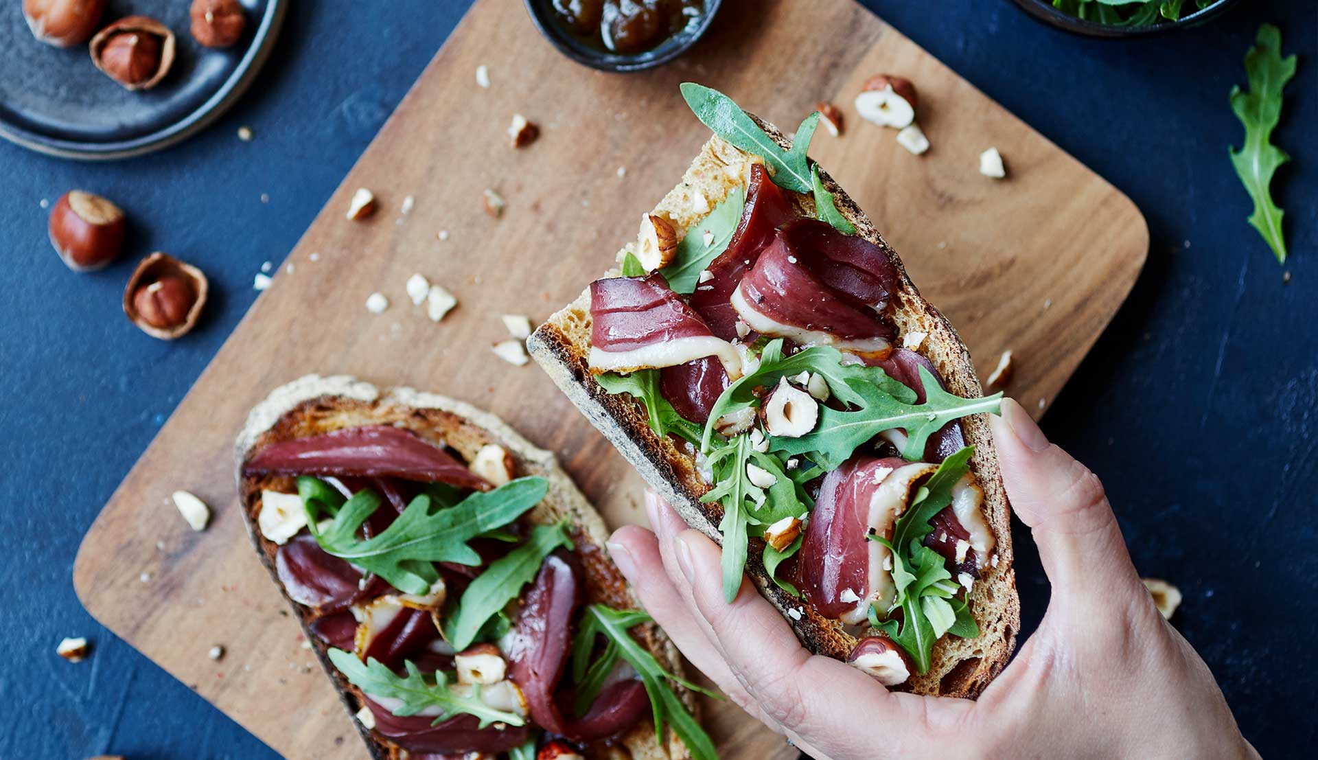 • 3. Garnissez les tartines avec la roquette et les tranches de magret séché.