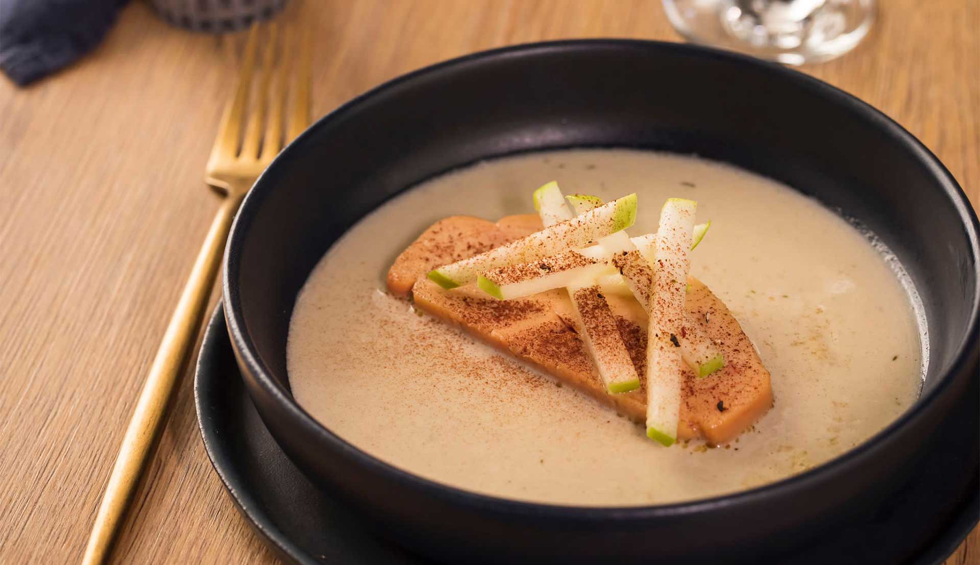 5. Faites une julienne avec la pomme verte puis saupoudrez de cacao, dressez le tout harmonieusement dans une assiette creuse et servez le velouté bien chaud dessus.