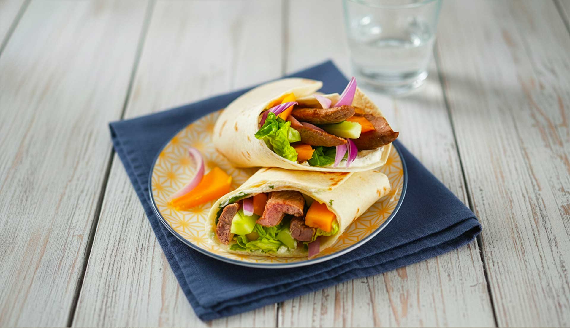 6. Placez au centre quelques aiguillettes, les bâtonnets de concombre et de mangue, un peu de salade et les oignons rouges. Disposez quelques brins de coriandre fraîche. Roulez les galettes en les serrant bien. Coupez-les en deux pour les déguster plus facilement.